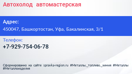 Автохолод+, автомастерская по адресу 450047, Башкортостан, Уфа, Бакалинская, 3/1 в дальнейшем Организация, размещена в следующих категориях: