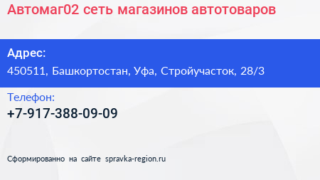 Автомаг02, сеть магазинов автотоваров по адресу 450511, Башкортостан, Уфа, Стройучасток, 28/3 в дальнейшем Организация, размещена в следующих категориях: