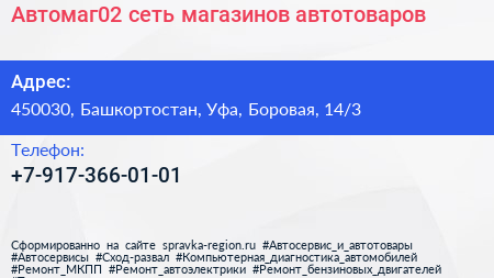 Автомаг02, сеть магазинов автотоваров по адресу 450030, Башкортостан, Уфа, Боровая, 14/3 в дальнейшем Организация, размещена в следующих категориях: