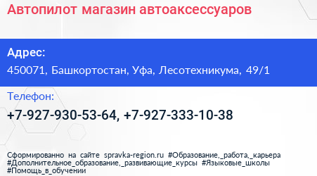 Автопилот, магазин автоаксессуаров по адресу 450071, Башкортостан, Уфа, Лесотехникума, 49/1 в дальнейшем Организация, размещена в следующих категориях: