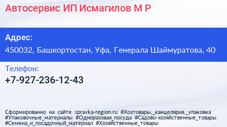 Автосервис, ИП Исмагилов М.Р. по адресу 450032, Башкортостан, Уфа, Генерала Шаймуратова, 40 в дальнейшем Организация, размещена в следующих категориях: