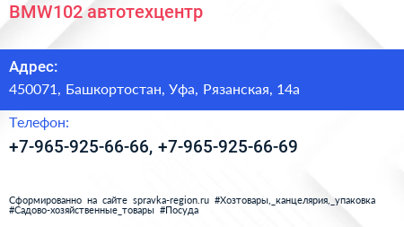 BMW102, автотехцентр по адресу 450071, Башкортостан, Уфа, Рязанская, 14а в дальнейшем Организация, размещена в следующих категориях: