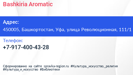Bashkiria Aromatic по адресу 450005, Башкортостан, Уфа, улица Революционная, 111/1 в дальнейшем Организация, размещена в следующих категориях: