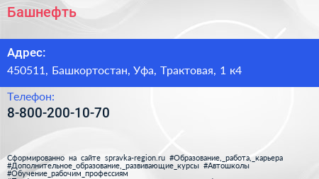 Башнефть по адресу 450511, Башкортостан, Уфа, Трактовая, 1 к4 в дальнейшем Организация, размещена в следующих категориях: