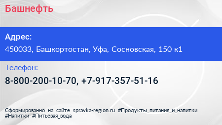 Башнефть по адресу 450033, Башкортостан, Уфа, Сосновская, 150 к1 в дальнейшем Организация, размещена в следующих категориях: