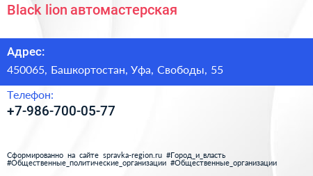 Black lion, автомастерская по адресу 450065, Башкортостан, Уфа, Свободы, 55 в дальнейшем Организация, размещена в следующих категориях: