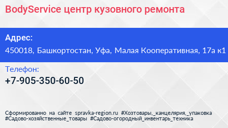 BodyService, центр кузовного ремонта по адресу 450018, Башкортостан, Уфа, Малая Кооперативная, 17а к1 в дальнейшем Организация, размещена в следующих категориях: