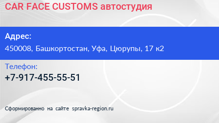 CAR FACE CUSTOMS, автостудия по адресу 450008, Башкортостан, Уфа, Цюрупы, 17 к2 в дальнейшем Организация, размещена в следующих категориях: