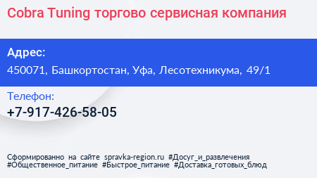 Cobra-Tuning, торгово-сервисная компания по адресу 450071, Башкортостан, Уфа, Лесотехникума, 49/1 в дальнейшем Организация, размещена в следующих категориях: