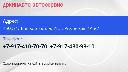 ДжинАвто, автосервис по адресу 450071, Башкортостан, Уфа, Рязанская, 14 к2 в дальнейшем Организация, размещена в следующих категориях: