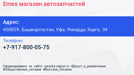 Emex, магазин автозапчастей по адресу 450059, Башкортостан, Уфа, Рихарда Зорге, 34 в дальнейшем Организация, размещена в следующих категориях: