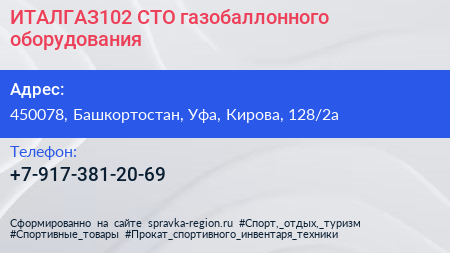ИТАЛГАЗ102, СТО газобаллонного оборудования по адресу 450078, Башкортостан, Уфа, Кирова, 128/2а в дальнейшем Организация, размещена в следующих категориях: