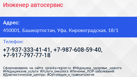 Инженер, автосервис по адресу 450001, Башкортостан, Уфа, Кировоградская, 18/1 в дальнейшем Организация, размещена в следующих категориях: