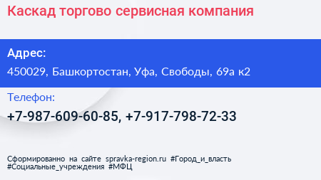 Каскад, торгово-сервисная компания по адресу 450029, Башкортостан, Уфа, Свободы, 69а к2 в дальнейшем Организация, размещена в следующих категориях: