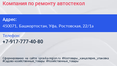 Компания по ремонту автостекол по адресу 450071, Башкортостан, Уфа, Ростовская, 22/1а в дальнейшем Организация, размещена в следующих категориях: