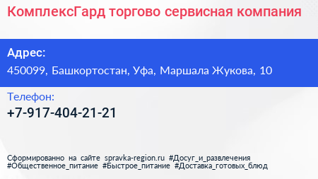 КомплексГард, торгово-сервисная компания по адресу 450099, Башкортостан, Уфа, Маршала Жукова, 10 в дальнейшем Организация, размещена в следующих категориях: