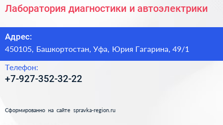 Лаборатория диагностики и автоэлектрики по адресу 450105, Башкортостан, Уфа, Юрия Гагарина, 49/1 в дальнейшем Организация, размещена в следующих категориях: