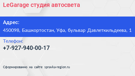 LeGarage, студия автосвета по адресу 450098, Башкортостан, Уфа, бульвар Давлеткильдеева, 1 в дальнейшем Организация, размещена в следующих категориях: