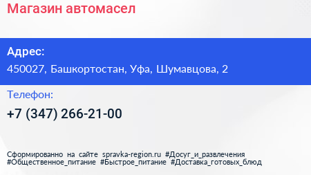 Магазин автомасел по адресу 450027, Башкортостан, Уфа, Шумавцова, 2 в дальнейшем Организация, размещена в следующих категориях: