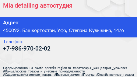 Mia detailing, автостудия по адресу 450092, Башкортостан, Уфа, Степана Кувыкина, 14/6 в дальнейшем Организация, размещена в следующих категориях: