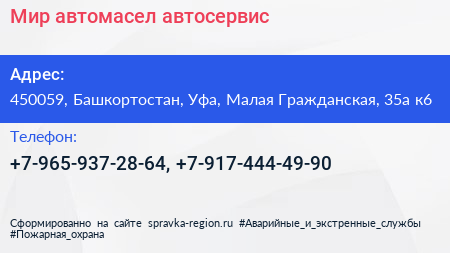 Мир автомасел, автосервис по адресу 450059, Башкортостан, Уфа, Малая Гражданская, 35а к6 в дальнейшем Организация, размещена в следующих категориях: