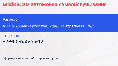 МойКаСам, автомойка самообслуживания по адресу 450095, Башкортостан, Уфа, Центральная, 9а/1 в дальнейшем Организация, размещена в следующих категориях: