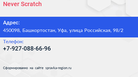 Never Scratch по адресу 450098, Башкортостан, Уфа, улица Российская, 98/2 в дальнейшем Организация, размещена в следующих категориях: