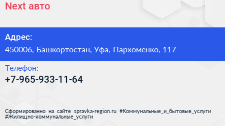 Next авто по адресу 450006, Башкортостан, Уфа, Пархоменко, 117 в дальнейшем Организация, размещена в следующих категориях: