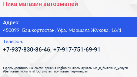 Ника, магазин автоэмалей по адресу 450099, Башкортостан, Уфа, Маршала Жукова, 16/1 в дальнейшем Организация, размещена в следующих категориях: