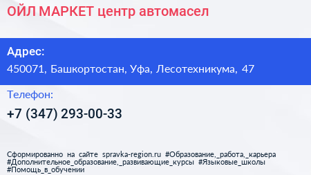 ОЙЛ-МАРКЕТ, центр автомасел по адресу 450071, Башкортостан, Уфа, Лесотехникума, 47 в дальнейшем Организация, размещена в следующих категориях: