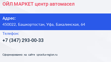 ОЙЛ-МАРКЕТ, центр автомасел по адресу 450022, Башкортостан, Уфа, Бакалинская, 64 в дальнейшем Организация, размещена в следующих категориях: