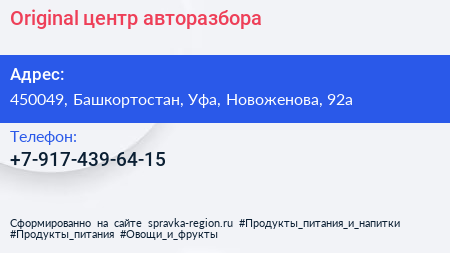 Original, центр авторазбора по адресу 450049, Башкортостан, Уфа, Новоженова, 92а в дальнейшем Организация, размещена в следующих категориях: