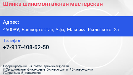 Шинка, шиномонтажная мастерская по адресу 450099, Башкортостан, Уфа, Максима Рыльского, 2а в дальнейшем Организация, размещена в следующих категориях: