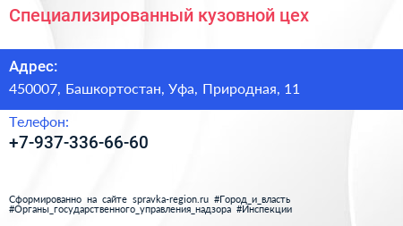 Специализированный кузовной цех по адресу 450007, Башкортостан, Уфа, Природная, 11 в дальнейшем Организация, размещена в следующих категориях: