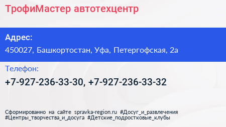 ТрофиМастер, автотехцентр по адресу 450027, Башкортостан, Уфа, Петергофская, 2а в дальнейшем Организация, размещена в следующих категориях: