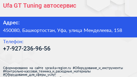 Ufa GT Tuning, автосервис по адресу 450080, Башкортостан, Уфа, улица Менделеева, 158 в дальнейшем Организация, размещена в следующих категориях: