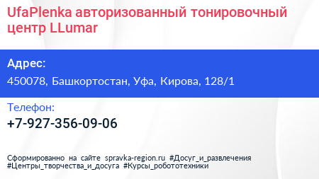 UfaPlenka, авторизованный тонировочный центр LLumar по адресу 450078, Башкортостан, Уфа, Кирова, 128/1 в дальнейшем Организация, размещена в следующих категориях: