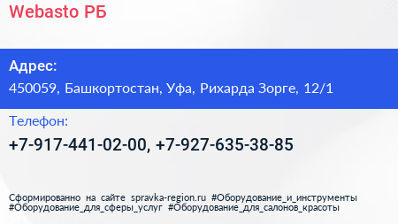 Webasto РБ по адресу 450059, Башкортостан, Уфа, Рихарда Зорге, 12/1 в дальнейшем Организация, размещена в следующих категориях: