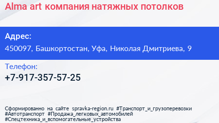 Alma art, компания натяжных потолков по адресу 450097, Башкортостан, Уфа, Николая Дмитриева, 9 в дальнейшем Организация, размещена в следующих категориях: