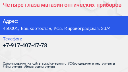 Четыре глаза, магазин оптических приборов по адресу 450001, Башкортостан, Уфа, Кировоградская, 33/4 в дальнейшем Организация, размещена в следующих категориях: