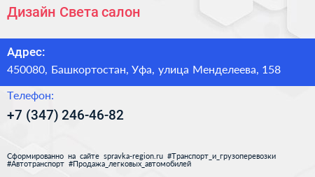 Дизайн Света, салон по адресу 450080, Башкортостан, Уфа, улица Менделеева, 158 в дальнейшем Организация, размещена в следующих категориях: