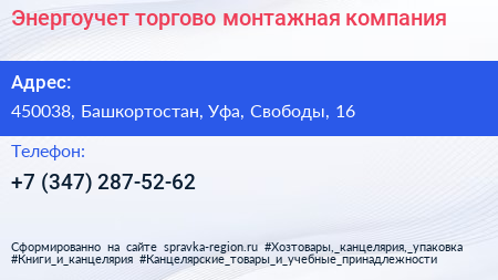 Энергоучет, торгово-монтажная компания по адресу 450038, Башкортостан, Уфа, Свободы, 16 в дальнейшем Организация, размещена в следующих категориях: