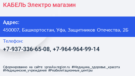 КАБЕЛЬ Электро, магазин по адресу 450007, Башкортостан, Уфа, Защитников Отечества, 2Б в дальнейшем Организация, размещена в следующих категориях: