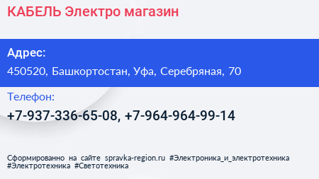 КАБЕЛЬ Электро, магазин по адресу 450520, Башкортостан, Уфа, Серебряная, 70 в дальнейшем Организация, размещена в следующих категориях: