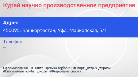 Курай, научно производственное предприятие по адресу 450095, Башкортостан, Уфа, Майкопская, 5/1 в дальнейшем Организация, размещена в следующих категориях: