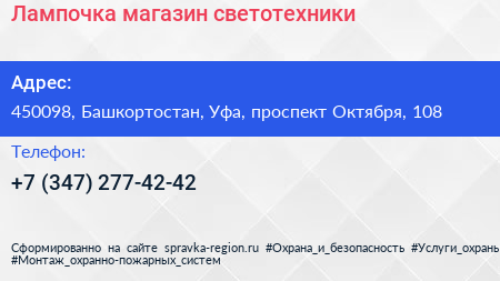 Лампочка, магазин светотехники по адресу 450098, Башкортостан, Уфа, проспект Октября, 108 в дальнейшем Организация, размещена в следующих категориях: