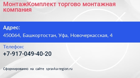 МонтажКомплект, торгово-монтажная компания по адресу 450064, Башкортостан, Уфа, Новочеркасская, 4 в дальнейшем Организация, размещена в следующих категориях: