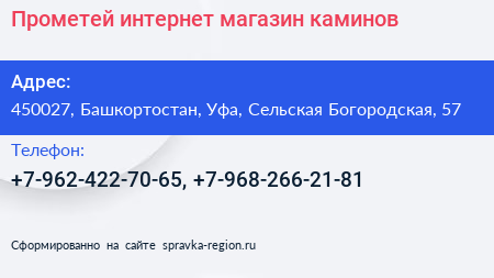 Прометей, интернет-магазин каминов по адресу 450027, Башкортостан, Уфа, Сельская Богородская, 57 в дальнейшем Организация, размещена в следующих категориях: