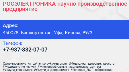 РОСЭЛЕКТРОНИКА, научно-производственное предприятие по адресу 450078, Башкортостан, Уфа, Кирова, 99/3 в дальнейшем Организация, размещена в следующих категориях: