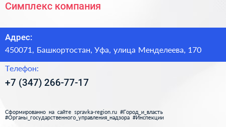 Симплекс, компания по адресу 450071, Башкортостан, Уфа, улица Менделеева, 170 в дальнейшем Организация, размещена в следующих категориях: